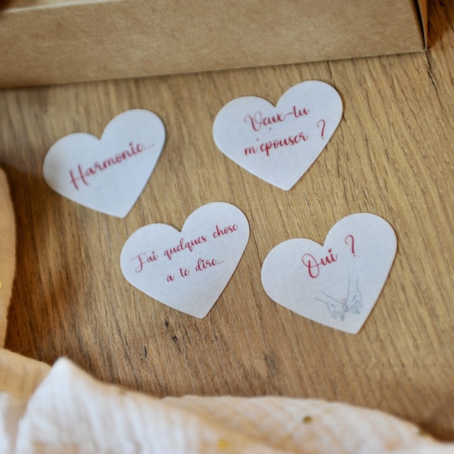 Oubliez les sentiers battus ! Ces biscuits personnalisés, faits main avec amour, cachent un message qui fera fondre le cœur de votre moitié. Un coffret de 4 biscuits numérotés vous guidera vers la question tant attendue : “Veux-tu m’épouser ?” Personnalisez chaque biscuit avec un prénom, un souvenir ou un petit mot doux. Un moment unique, gourmand et romantique, à savourer à deux.